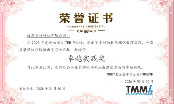 子公司维恩贝特科技有限公司凭借其在测试能力成熟度集成模型(TMMi)领域的深入探索与卓越应用,从众多参评企业中脱颖而出,荣膺2025年度TMMi“卓越实践奖”。